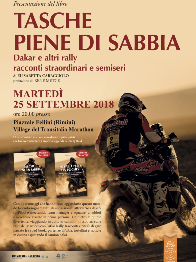 MARTEDÌ 25 SETTEMBRE 2018 – ore 20.00 presso Piazzale Fellini, al Village del Transitalia Marathon TASCHE PIENE DI SABBIA Dakar e altri rally, racconti straordinari e semiseri di ELISABETTA CARACCIOLO prefazione di RENÉ METGE Con i personaggi che hanno reso leggendario questo mondo facendo sognare tutti gli appassionati attraverso i deserti. Piloti e meccanici,…